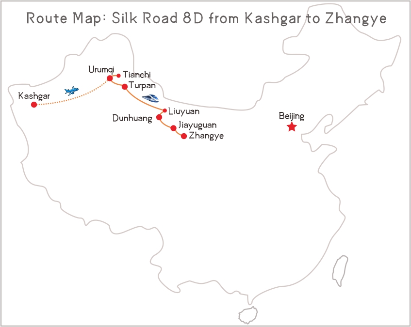 Silk Road is an amazing historical route in the ancient time. This wonderful tour will let you explore all must-see sites on the ancient China Silk Road from Kashgar to Urumiq, Turpan, Dunhuang, Jiayuguan and Zhangye in 8 days. It is a cultural tour to learn the history in the old time of western China, modern Xinjiang and Gansu province. Moreover, the fantastic landscape is impressive to view along the Silk Road.