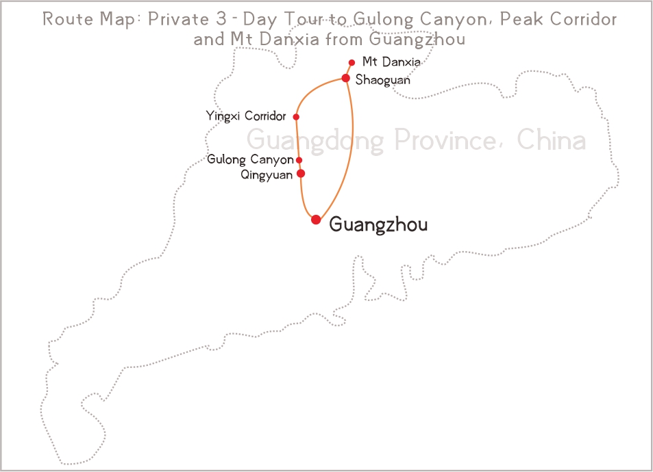 Gulong Canyon, Yingde Peak Corridors and Danxia Mount are three amazing attractions in northern Guangdong Province, this 3-day private tour will let you explore them with a local guide by private vehicle from Guangzhou. You will enjoy the natural sightseeing with us. Centrally located Guangzhou hotel pickup and drop-off are included.