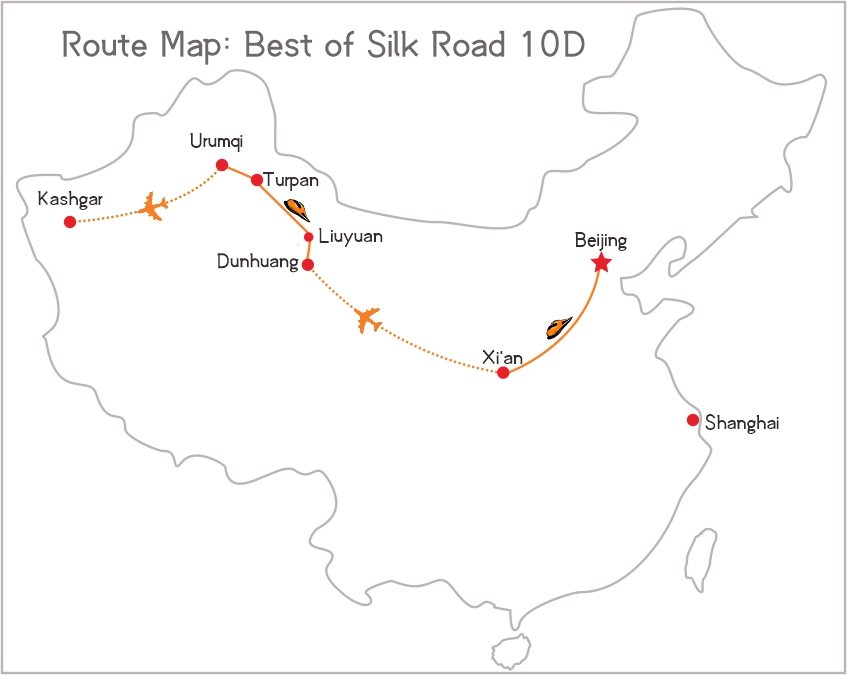This 10-day Silk Road tour takes you to explore the Chinese section of ancient Silk Road from Beijing to Xi'an, then to Kashgar. You will travel to Beijing, Xi'an, Dunhuang, Turpan, Urumqi and Kashgar by bullet train, flight and chartered vehicle. It is a wonferful tour to learn the history about the Silk Road, and view the fantastic landscape in northern and western China in a quick pace.